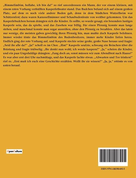 ¿Bimmelimbim, hollahe, ich bin da!¿ so rief unverdrossen ein Mann, der vor einem kleinen, mit einem roten Vorhang verhüllten Kasperletheater stand. Das Budchen befand sich auf einem großen Platz, auf dem es noch viele andere Buden gab, denn in dem Städtchen Wutzelheim war Schützenfest; dazu waren Karussellmänner und Schaubudenleute von weither gekommen. Um das Kasperlebudchen herum drängten sich die Kinder. Es sollte, so wurde gesagt, ein besonders lustiges Kasperle sein, das da spielte, und das Zusehen war billig. Für einen Pfennig konnte man lange stehen, und manchmal konnte man sogar ausreißen, ohne den Pfennig zu bezahlen. Aber das taten nur wenige, die meisten gaben gewichtig ihren Pfennig hin, man mußte doch Kasperle belohnen. Immer wieder tönte das Bimmelimbim des Budenbesitzers, immer mehr Kinder liefen herzu. Endlich ging der rote Vorhang auf, und Kasperle steckte seine große, große Nase heraus und fragte: ¿Seid ihr alle da?¿ ¿Ja!¿ scholl es im Chor. ¿Hm!¿ Kasperle seufzte, schwang ein Beinchen über die Brüstung und fragte trübselig: ¿Ihr denkt nun wohl, ich werde kaspern?¿ ¿Ja,¿ schrien die Kinder, und ein paar Ungeduldige drängten: ¿Fang doch an, sonst müssen wir zum Abendbrot nach Hause!¿ Es war aber erst drei Uhr nachmittags, und das Kasperle lachte etwas. ¿Abwarten und Tee trinken!¿ rief es. ¿Erst muß ich euch eine Geschichte erzählen. Wollt ihr sie wissen?¿ ¿Ja, ja,¿ ertönte es von unten herauf.