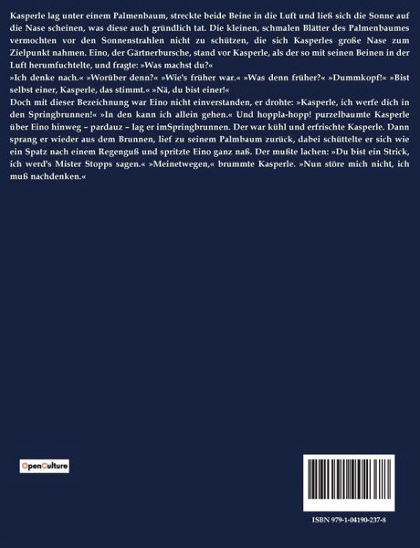 Kasperle lag unter einem Palmenbaum, streckte beide Beine in die Luft und ließ sich die Sonne auf die Nase scheinen, was diese auch gründlich tat. Die kleinen, schmalen Blätter des Palmenbaumes vermochten vor den Sonnenstrahlen nicht zu schützen, die sich Kasperles große Nase zum Zielpunkt nahmen. Eino, der Gärtnerbursche, stand vor Kasperle, als der so mit seinen Beinen in der Luft herumfuchtelte, und fragte: »Was machst du?« »Ich denke nach.« »Worüber denn?« »Wie's früher war.« »Was denn früher?« »Dummkopf!« »Bist selbst einer, Kasperle, das stimmt.« »Nä, du bist einer!« Doch mit dieser Bezeichnung war Eino nicht einverstanden, er drohte: »Kasperle, ich werfe dich in den Springbrunnen!« »In den kann ich allein gehen.« Und hoppla-hopp! purzelbaumte Kasperle über Eino hinweg ¿ pardauz ¿ lag er imSpringbrunnen. Der war kühl und erfrischte Kasperle. Dann sprang er wieder aus dem Brunnen, lief zu seinem Palmbaum zurück, dabei schüttelte er sich wie ein Spatz nach einem Regenguß und spritzte Eino ganz naß. Der mußte lachen: »Du bist ein Strick, ich werd's Mister Stopps sagen.« »Meinetwegen,« brummte Kasperle. »Nun störe mich nicht, ich muß nachdenken.«