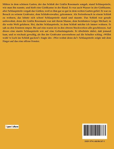 Mitten in dem schönen Garten, der das Schloß der Gräfin Rosemarie umgab, stand Schlaupeterle, wie man ihn nannte, und hielt eine Gießkanne in der Hand. Es war auch Wasser in der Gießkanne, aber Schlaupeterle vergaß das Gießen, weil es ihm gar so gut in dem weiten Garten gefiel. Er war zu Besuch zu seinem Großvater, dem Schloßverwalter, gekommen. Als Ferienbesuch in einem Schloß zu wohnen, das lohnte sich schon! Schlaupeterle stand und staunte. Das Schloß war gerade unbewohnt, denn die Gräfin Rosemarie war mit ihrem Manne, dem berühmten Geiger Michael, in die weite Welt gefahren. Hei, dachte Schlaupeterle, in dem Schloß möchte ich immer wohnen. Er sah zu den Fenstern empor. Bis auf eins waren sie in den oberen Stockwerken alle geschlossen. Auf dieses eine starrte Schlaupeterle wie auf eine Geburtstagstorte. Er überhörte dabei, daß jemand kam, und er erschrak gewaltig, als ihn der Großvater unversehens auf die Schulter schlug. »Willst wohl 'n Loch ins Schloß gucken?« fragte der. »Wer wohnt denn da?« Schlaupeterle zeigte mit dem Finger auf das eine offene Fenster.