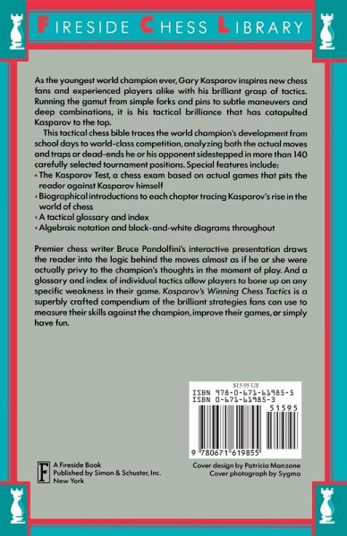 From America’s foremost chess coach and game strategist for Netflix’s The Queen’s Gambit comes a superbly crafted compendium of brilliant strategies fans can use to measure their skills against the champion, improve their game, or simply have fun. As the youngest world champion ever, Gary Kasparov inspires new chess fans and experienced players alike with his brilliant grasp of tactics. Running the gamut from simple forks and pins to subtle maneuvers and deep combinations, it is his tactical brilliance that catapulted Kasparov to the top. This tactical chess bible traces the world champion’s development from school days to world-class competition, analyzing both the actual moves and traps or dead-ends he or his opponent sidestepped in more than 140 carefully selected tournament positions. Includes a glossary and index of individual tactics allowing players to bone up on any specific weakness in the game.