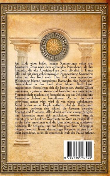 Am Ende eines heißen langen Sommertages sehnt sich Kassandra Cross nach dem erlösenden Feierabend, als ihre Freundin, die alte Aborigine-Frau Eerin plötzlich in Trance fällt und mit einer geheimnisvollen Prophezeiung Kassandras Leben auf den Kopf stellt. Dem Ruf dieser mysteriösen Weissagung folgend unternimmt Kassandra eine Reise nach Griechenland in das Land ihrer Ahnen. Doch kaum angekommen überstürzen sich die Ereignisse. Antike Götter erscheinen, mystische Wesen und Gestalten aus einer fernen Vergangenheit machen sich bemerkbar, um das Schicksal und Kassandras Leben zu beeinflussen. Als ob das nicht verwirrend genug wäre, wird sie von einem unbekannten Feind in das antike Delphi entführt. Auf der Suche nach Antworten verlieren sich schnell die Grenzen zwischen Realität und Phantasie. Alles deutet auf eine einzige Aufgabe hin. Kassandra muss sich entscheiden, welchen Weg sie nimmt, um den Lauf der Geschichte ins Gute zu lenken. Wird sie ihr Erbe annehmen und die Herausforderung erfolgreich bestehen. Ihr Schicksal und das Überleben ihrer Ahnenreihe hängen davon ab. Kassandras einziger Ratgeber ist eine Eule, nicht irgendeine, es ist die sprechende Eule der Pallas Athene.