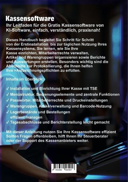 Dieses Handbuch begleitet Sie Schritt für Schritt von der Erstinstallation bis zur täglichen Nutzung Ihres Kassensystems. Sie lernen, wie Sie Ihre Kasse einrichten, Mitarbeiterrechte verwalten, Artikel und Warengruppen organisieren sowie Berichte und Auswertungen erstellen. Besonders wichtig sind die Abschnitte zur Protokollierung, die Ihnen helfen, Ihre steuerlichen Pflichten zu erfüllen.Inhalte im Überblick: Installation und Einrichtung der Friseurkasse mit TSE (optional obligatorisch) Menüstruktur, Bedienungselemente und zentrale Funktionen Passwörter, Mitarbeiterrechte und Druckeinstellungen Warengruppen, Artikelverwaltung und Barcode-Nutzung Trinkgelder, Lagerbestände und Bestellungen effizient managen Tagesabschlüsse und Berichterstellung leicht gemachtMit dieser Anleitung nutzen Sie Ihre Kassensoftware effizient und gesetzeskonform. Sollten Fragen offenbleiben, hilft Ihnen Ihr Steuerberater oder der Support des Kassenanbieters weiter.