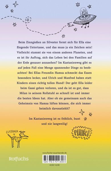 Das Jahr im Kastanienweg beginnt mit einer fliegenden Untertasse! Die formt sich für Ella nämlich beim Zinngießen, und das muss ja ein Zeichen sein. Vielleicht stammt sie von einem anderen Planeten, und es ist ihr Auftrag, sich das Erdenleben bei den Erden-Familien genauer anzusehen? Und sie kann auch gleich loslegen, denn auf der Suche nach dem kleinen Nachbarshund beteiligen sich alle Kinder der Straße, allen voran Milan, der in seinem Rollstuhl der Allerschnellste ist! Ob sie gemeinsam auch das Geheimnis von Ellas Freundin Hamza lüften können, die sich immer heimlich davonstiehlt? Aber erst muss noch das Rätsel um den Inhalt des blauen Koffers gelöst werden, und dafür sind natürlich alle Bewohner des Kastanienwegs zur Stelle ...