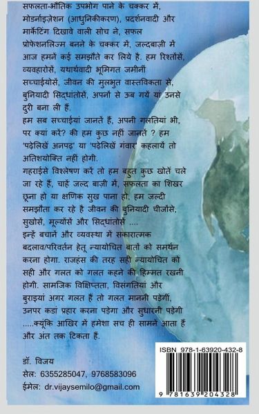 Safalata-Bhautik Upbhog pane ke chakkar mein, modernization (aadhunikaran), pradarshanwadi aur marketing dikhavewali soch nein, safal professionalism ke chakkar mein, jaldbazi mein aaj hamne kayi samjhaute kar liye hain. Ham Rishtosein, vyavaharosein, yatharthwadi bhumigat jamini sachhaiyose, jivan ki mulbhut vastavikata se, buniyadi siddhantosein, apnosein ub gayein hain yan unsein duri bana li hain. ham apne jivan mein aur apne aaspas hone wali gatividhiyon par keval ek mukdarshak ki bhanti nazar rakhte hain, kabhi kabhar social media par apna ugaal nikal lete hain. sab vaisa hi chalta aa raha hai aur hota rahega. ham padhe-likhein anpadh ya padhe-likhe ganvaar kahlayein to atishayokti nahi hogi. ham sab sacchaiyaan jantein hain, apni galtiyaan bhi, par kyaan karein? ki ham kuchh nahi jante ? Gahrayi se vishleshan karein to ham bahut kuchh khote chale jaa rahein hain, chahein jaldbazi mein, safalata ka shikhar chhuna ho ya kshanik sukh paana ho ham jaldi samjhauta kar rahein hain jivan ki buniyadi cheezosein, sukhosein, mulyosein aur siddhantosein ......... Inhein bachanein aur vyavastha mein agar sakaratmak badlav/parivartan hetu nyayochit bato ka samarthan karna hoga. RajHans ki tarah sahi nyayochit ko sahi aur galat ko galat kahne ki himmat rakhni hogi. Samajik Vikshiptata, visangatiyan aur buraiyaan agar galat hain to galat manani padegi, Unpar kada prahaar karna padega aur sudharani padegi.