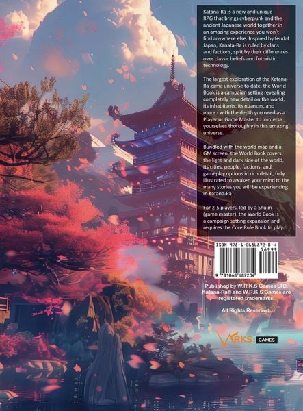 Katana-Ra is a new and unique RPG that brings cyberpunk and the ancient Japanese world together in an amazing experience you won't find anywhere else. Inspired by feudal Japan, Kanata-Ra is ruled by clans and factions, split by their differences over classic beliefs and futuristic technology. The largest exploration of the Katana-Ra game universe to date, the World Book is a campaign setting that reveals completely new details on the world, its inhabitants, its nuances, and more-with the depth you need as a Player or Game Master to immerse yourself thoroughly in this amazing universe. Bundled with the world map and a GM screen, the World Book covers the light and dark side of the world, its cities, people, factions, and gameplay options in rich detail, fully illustrated to awaken your mind to the many stories you will be experiencing in Katana-Ra. For 2-5 players, led by a Shujin (game master), the World Book is a campaign setting expansion and requires the Core Rule Book to play.
