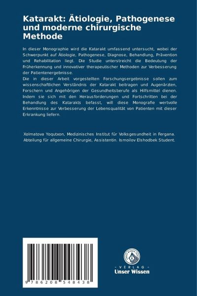 In dieser Monographie wird die Katarakt umfassend untersucht, wobei der Schwerpunkt auf Ätiologie, Pathogenese, Diagnose, Behandlung, Prävention und Rehabilitation liegt. Die Studie unterstreicht die Bedeutung der Früherkennung und innovativer therapeutischer Methoden zur Verbesserung der Patientenergebnisse.Die in dieser Arbeit vorgestellten Forschungsergebnisse sollen zum wissenschaftlichen Verständnis der Katarakt beitragen und Augenärzten, Forschern und Angehörigen der Gesundheitsberufe als Hilfsmittel dienen. Indem sie sich mit den Herausforderungen und Fortschritten bei der Behandlung des Katarakts befasst, will diese Monografie wertvolle Erkenntnisse zur Verbesserung der Lebensqualität von Patienten mit dieser Erkrankung liefern.