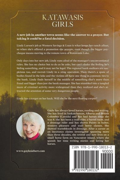 A new job in another town seems like the answer to a prayer. But taking it could be a fatal decision. Lindy Larsen's job at Western Savings & Loan is what keeps her ranch afloat, so when she's offered a promotion she accepts, even though the bigger paycheque means moving to the remote town of Katawasis Lake. Only days into her new job, Lindy runs afoul of the manager's unconventional rules. She has no choice but to do as he asks, but can't shake the feeling he's hiding something, and it may not be legal. The regional bank auditors are suspicious too, and recruit Lindy in a sting operation. Then there's a spate of bodies found in the lake and the victims all have one thing in common: ties to the bank. Lindy finds herself in the middle of something that's more than fraud and bigger than just the bank manager. She has stumbled into a tangled maze of criminal activity more widespread than they realized and she's attracted the attention of some very dangerous people. Lindy has a target on her back. Will she be the next floating corpse?