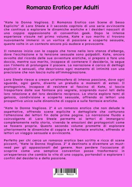 "Kate la Donna Vogliosa. 2: Romanzo Erotico con Scene di Sesso Esplicito" di Lara Steele è il secondo capitolo di una serie avvincente che continua a esplorare le dinamiche erotiche e i desideri nascosti di una coppia appassionata di convention geek. Dopo le intense esperienze vissute nel primo volume, Kate e suo marito si trovano nuovamente immersi in un vortice di passione e scoperta sessuale, questa volta in un contesto ancora più audace e provocante.Il romanzo inizia con la coppia che torna nella loro stanza d'albergo, dove l'eccitazione e la tensione sessuale sono palpabili. Kate, ancora avvolta dal ricordo delle sue avventure erotiche, si prepara a fare una doccia, mentre suo marito, incapace di contenere il desiderio, la segue con l'intento di prolungare il piacere. La narrazione è carica di dettagli espliciti e sensuali, che descrivono ogni momento di intimità con una precisione che non lascia nulla all'immaginazione.Lara Steele riesce a creare un'atmosfera di intensa passione, dove ogni sguardo, ogni gesto, diventa un preludio a momenti di estasi. Il protagonista, incapace di resistere al fascino di Kate, si lascia trasportare dalle sue fantasie più segrete, scoprendo nuovi lati della loro relazione e del loro desiderio reciproco. La storia esplora temi di gelosia, condivisione e scoperta sessuale, offrendo ai lettori una prospettiva unica sulle dinamiche di coppia e sulle fantasie erotiche."Kate la Donna Vogliosa. 2" è un romanzo erotico che non delude le aspettative, offrendo scene esplicite e dettagliate che catturano l'attenzione dei lettori fin dalle prime pagine. La narrazione fluida e coinvolgente di Lara Steele permette ai lettori di immergersi completamente nella storia, vivendo le emozioni dei protagonisti come se fossero proprie. Questo secondo volume promette di esplorare ulteriormente le dinamiche di coppia e le fantasie erotiche, offrendo ai lettori un viaggio sensuale e avvincente.Perfetto per chi cerca un romanzo erotico ben scritto e ricco di scene piccanti, "Kate la Donna Vogliosa. 2" è destinato a diventare un must-read per gli appassionati del genere. Non perdere l'occasione di scoprire come una semplice convention possa trasformarsi in un'esperienza che cambia la vita di una coppia, portandoli a esplorare i confini del desiderio e della passione.