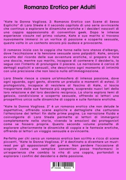 "Kate la Donna Vogliosa. 2: Romanzo Erotico con Scene di Sesso Esplicito" di Lara Steele è il secondo capitolo di una serie avvincente che continua a esplorare le dinamiche erotiche e i desideri nascosti di una coppia appassionata di convention geek. Dopo le intense esperienze vissute nel primo volume, Kate e suo marito si trovano nuovamente immersi in un vortice di passione e scoperta sessuale, questa volta in un contesto ancora più audace e provocante.Il romanzo inizia con la coppia che torna nella loro stanza d'albergo, dove l'eccitazione e la tensione sessuale sono palpabili. Kate, ancora avvolta dal ricordo delle sue avventure erotiche, si prepara a fare una doccia, mentre suo marito, incapace di contenere il desiderio, la segue con l'intento di prolungare il piacere. La narrazione è carica di dettagli espliciti e sensuali, che descrivono ogni momento di intimità con una precisione che non lascia nulla all'immaginazione.Lara Steele riesce a creare un'atmosfera di intensa passione, dove ogni sguardo, ogni gesto, diventa un preludio a momenti di estasi. Il protagonista, incapace di resistere al fascino di Kate, si lascia trasportare dalle sue fantasie più segrete, scoprendo nuovi lati della loro relazione e del loro desiderio reciproco. La storia esplora temi di gelosia, condivisione e scoperta sessuale, offrendo ai lettori una prospettiva unica sulle dinamiche di coppia e sulle fantasie erotiche."Kate la Donna Vogliosa. 2" è un romanzo erotico che non delude le aspettative, offrendo scene esplicite e dettagliate che catturano l'attenzione dei lettori fin dalle prime pagine. La narrazione fluida e coinvolgente di Lara Steele permette ai lettori di immergersi completamente nella storia, vivendo le emozioni dei protagonisti come se fossero proprie. Questo secondo volume promette di esplorare ulteriormente le dinamiche di coppia e le fantasie erotiche, offrendo ai lettori un viaggio sensuale e avvincente.Perfetto per chi cerca un romanzo erotico ben scritto e ricco di scene piccanti, "Kate la Donna Vogliosa. 2" è destinato a diventare un must-read per gli appassionati del genere. Non perdere l'occasione di scoprire come una semplice convention possa trasformarsi in un'esperienza che cambia la vita di una coppia, portandoli a esplorare i confini del desiderio e della passione.