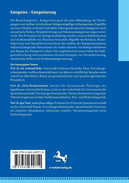 - Einführung.- Der Begriff der Relation als Werkzeug zur Kategorisierung sprachlicher Einheiten in allgemein-philosophischen Grammatiken.- Das Binaritätsprinzip bei der sprachlichen Kategorisierung.- Jean Fourquets Kategorienzeichen und die Opposition da vs so.- Kategoriale Homonymie.- Der Nebensatz als linguistische Kategorie.- Der Perspektivierungsbegriff im Denken, in der Sprache und in der Kultur.- Nichtsätze / Verblose Sätze und semantische Rollen.- Situationskonzept(e) an der Schnittstelle zwischen Linguistik, Soziologie und Psychologie.- Ist 'es' ein Subjekt?- Situationskategorisierungen über technisch-semiotische Dispositive im öffentlichen Raum.