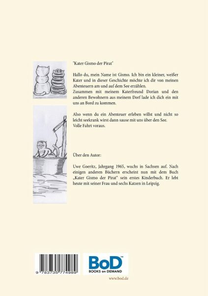 "Kater Gismo der Pirat"Hallo du, mein Name ist Gismo. Ich bin ein kleiner, weißer Kater und in dieser Geschichte möchte ich dir von meinen Abenteuern am und auf dem See erzählen. Zusammen mit meinem Katerfreund Dorian und den anderen Bewohnern aus meinem Dorf lade ich dich ein mit uns an Bord zu kommen. Also wenn du ein Abenteuer erleben willst und nicht so leicht seekrank wirst dann sause mit uns über den See. Volle Fahrt voraus.Der kleine Kater Gismo und seine Freunde erleben lustige Abenteuer um, auf und in dem See bei ihrem Dorf. Eine kleine Geschichte die mit spaßigen Dialogen und Bildern für Lebendigkeit und besondere Nähe zum Geschehen sorgt. Detailreiche Beschreibungen erschaffen ein besonders plastisches Bild vor dem inneren Auge des Lesers.Fazit:Für Kinder und jung gebliebene Erwachsene sehr Empfehlenswert.