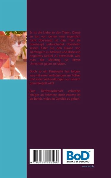 Es ist die Liebe zu den Tieren, Dinge zu tun von denen man eigentlich nicht überzeugt ist, dass man sie überhaupt unbeschadet übersteht; seinen Kater aus den Klauen von Tierfängern zu befreien und dabei ein negatives Gefühl zu entwickelt, weil man der Meinung ist, etwas Unrechtes getan zu haben. Doch so ein Faustrecht hat folgen, was mit einer Vorladungen zur Polizei und einer Verhandlungen vor Gericht gemaßregelt wird.Eine Tierfreundschaft erfordert einiges an Schmerz, doch ebenso ist sie bereit, vieles an Gefühle zu geben.