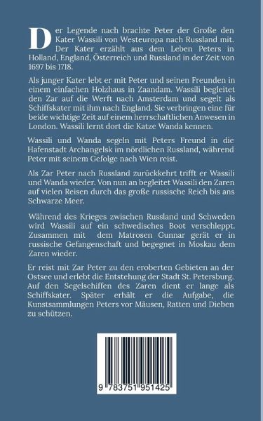 Der Legende nach brachte Peter der Große den Kater Wassili von Westeuropa nach Russland mit. Der Kater erzählt aus dem Leben Peters in Holland, England, Österreich und Russland in der Zeit von 1697 bis 1718.Als junger Kater lebt er mit Peter und seinen Freunden in einem einfachen Holzhaus in Zaandam. Wassili begleitet den Zar auf die Werft nach Amsterdam und segelt als Schiffskater mit ihm nach England. Sie verbringen eine für beide wichtige Zeit auf einem herrschaftlichen Anwesen in London. Wassili lernt dort die Katze Wanda kennen.Wassili und Wanda segeln mit Peters Freund in die Hafenstadt Archangelsk im nördlichen Russland, während Peter mit seinem Gefolge nach Wien reist.Als Zar Peter nach Russland zurückkehrt trifft er Wassili und Wanda wieder. Von nun an begleitet Wassili den Zaren auf vielen Reisen durch das große russische Reich bis ans Schwarze Meer.Während des Krieges zwischen Russland und Schweden wird Wassili auf ein schwedisches Boot verschleppt. Zusammen mit dem Matrosen Gunnar gerät er in russische Gefangenschaft und begegnet in Moskau dem Zaren wieder.Er reist mit Zar Peter zu den eroberten Gebieten an der Ostsee und erlebt die Entstehung der Stadt St. Petersburg. Auf den Segelschiffen des Zaren dient er lange als Schiffskater. Später erhält er die Aufgabe, die Kunstsammlungen Peters vor Mäusen, Ratten und Dieben zu schützen.