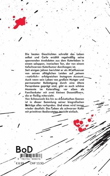 Die besten Geschichten schreibt das Leben selbst und Carlo erzählt regelmäßig seine spannenden Anekdoten aus dem Katerleben in einem saloppen, ironischen Ton, der manchmal von einem tiefschwarzen Katerhumor durchzogen ist.Seit einigen Jahren berichtet er als Catfluencer aus seiner Perspektive von seinen alltäglichen Leiden auf seinem - natürlich - erfolgreichen Instagram-Account. Nun endlich gibt es diese spannenden Erzählungen auch als Taschenbuchformat. Auch wenn es nicht immer zu jeder Zeit Futter gibt und sein Leben von Hunger und Belästigung seiner Mitbewohnerin, der Perserdame, geprägt ist, gibt es auch viele schöne Momente im Kateralltag; vor allem als Familienkater mit zwei kleinen Dosenöffnern, die er fleißig miterzieht.Von Schmunzeln bis hin zu hochdramatischen Szenen ist in dieser Sammlung seiner biografischen Beiträge alles vorhanden. Aber eines ist klar: Das Leben als schwarzer Kater mit primitiven Bediensteten ist nicht immer einfach.