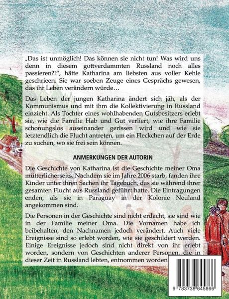 Katharina wächst in den turbulenten 1930er Jahren im bolschewistischen Russland auf. Sie erlebt mit, wie ihr Vater als reicher Bauer alles verliert, was er sein Eigen nennt. Sogar das Stimmrecht wird ihm genommen. Einige Jahre später wird ihr Vater, wie unzählige andere Väter auch und auch einer ihrer Brüder vom russischen Geheimdienst geholt und verschwindet auf Nimmerwiedersehen. 1943 flieht Katharina zusammen mit ihrer Mutter und einigen Geschwistern in eine ungewisse Zukunft, in eine Welt, in der sie Freiheit zu finden hofft. Viele scheinbar unüberwindbare Hindernisse stellen sich ihnen in den Weg: Kälte, Schlamm, Hunger und Angst; und rundherum tobt der 2. Weltkrieg. Unterwegs stirbt noch die geschwächte Mutter und sie können sie nicht einmal begraben... In Deutschland angekommen, lassen sie sich einbürgern. Schon bald darauf wird ihr volljähriger Bruder in den Krieg eingezogen. Diese und viele andere Erlebnisse belasten den guten Glauben und die Hoffnung, endlich frei zu sein. Anmerkung: Dieses Buch basiert auf Tagebucheinträgen meiner Großmutter mütterlicherseits. Ein Tagebuch, das sie während ihrer gesamten Flucht geführt hat. Da die Aufzeichnungen jedoch sehr unvollkommen waren, habe ich weitere Personen und Erlebnisse aus diesem Zeitgeschehen hinzugenommen, um darzustellen, was unsere Vorfahren alles erleben und durchleben mussten. Es ist daher keine Biografie meiner Großmutter.