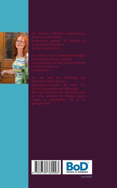 Die Autorin Jadranka Ivanovic-Bolog, Kroatin, wurde in Kotor, Montenegro, geboren. Sie studierte in Sarajewo und lebt jetzt in Stuttgart, Deutschland. Sie schrieb mehrere Gedichtsammlungen in kroatischer Sprache und jetzt ist es das erste mal, dass sie ihre Gedichte in deutscher Sprache veröffentlicht. Vor uns liegt eine Mischung von alternativer Poesie, lyrische Gegenüberstellungen der Kraft des Geistes, Sehnsüchte und Hoffnungen.Wie eine Forscherin der Wahrheit, nicht nur ihrer, versucht die Autorin eigene Fragen zu beantworten. Ob es ihr gelingen wird?
