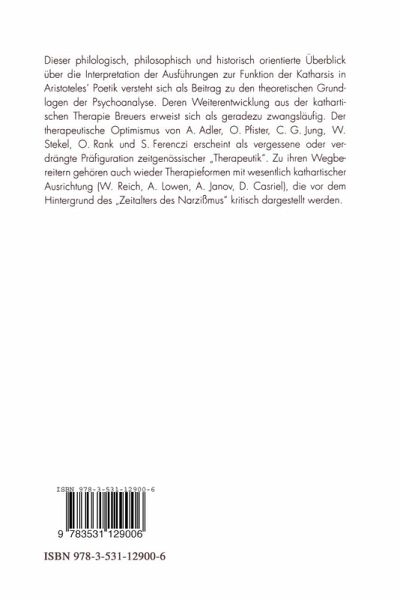 1. Einleitung.- 1.1. Präludium: Eisegetische Paraphrase auf Delphi.- 1.2. Theologische Motive hinter der Kritik der Katharsis: Verborgene Fragestellungen und ein (eminent) praktisch theologisches und diagnostisches Interesse.- 1.3. "Katharsis" als Kristallisationsbegriff?.- 1.4. Literaturhinweise zum Einfluss von Bernays auf Breuer/Freud und zu Monographien über die Katharsis in der Psychotherapie.- 2. K??????? ????????? - katharsis pathematon.- 2.1. Der Ausgangspunkt von Aristoteles: Mimetische Kunst bei Plato.- 2.2. Aristoteles' Poetik.- 2.3. Zusammenfassung und Ergebnisse.- 2.4. Exkurse.- 3. Vom "kathartischen Heilverfahren" zur Psychoanalyse.- 3.1. Die Krankheit der Anna O. und ihre Behandlung.- 3.2. Die Entwicklung und Ausgestaltung der Psychoanalyse.- 4. Über therapeutischen Optimismus.- 4.1. Alfred Adler (1870-1937).- 4.2. C. G. Jung (1875-1961).- 4.3. Wilhelm Stekel (1868-1940).- 4.4. Otto Rank (1884-1939).- 4.5. Sandor Ferenczi (1873-1933).- 5. Einige neuere Therapieformen mit kathartischer Ausrichtung - Kathartische Erlebnisse als Eigenstimulation.- 5.1. Zur Auswahl.- 5.2. Ein möglicher Hintergrund: Überlegungen zu Erlebnis-Sehnsüchten im "Zeitalter des Narzissmus".- 5.3. Zeitgenössische Therapieformen mit wesentlich kathartischer Ausrichtung.- 5.4. Ausblick. Eine Polemik.- Literatur.