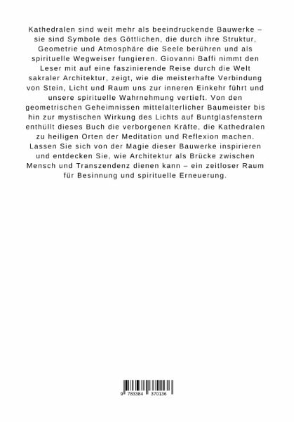 Kathedralen sind weit mehr als beeindruckende Bauwerke - sie sind Symbole des Göttlichen, die durch ihre Struktur, Geometrie und Atmosphäre die Seele berühren und als spirituelle Wegweiser fungieren. Giovanni Baffi nimmt den Leser mit auf eine faszinierende Reise durch die Welt sakraler Architektur, zeigt, wie die meisterhafte Verbindung von Stein, Licht und Raum uns zur inneren Einkehr führt und unsere spirituelle Wahrnehmung vertieft. Von den geometrischen Geheimnissen mittelalterlicher Baumeister bis hin zur mystischen Wirkung des Lichts auf Buntglasfenstern enthüllt dieses Buch die verborgenen Kräfte, die Kathedralen zu heiligen Orten der Meditation und Reflexion machen.Lassen Sie sich von der Magie dieser Bauwerke inspirieren und entdecken Sie, wie Architektur als Brücke zwischen Mensch und Transzendenz dienen kann - ein zeitloser Raum für Besinnung und spirituelle Erneuerung.
