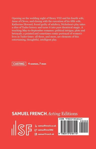 Opening on the wedding night of Henry VIII and his fourth wife, Anne of Cleves, and closing with the execution of his fifth wife, Katherine Howard, found guilty of adultery, Nicholson's play takes a slice of Tudor history and turns it into pure theatrical magic. A touching May-to-September romance; political intrigue, plots and betrayals; a pointed and sometimes comic portrayal of women's lives in Tudor times: all these, and more, are elements of this entertaining, thoughtful, intelligent play.4 women, 7 men