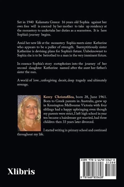 Set in 1940 Kalamata Greece 16 years old Sophia against her own free will is coerced by her mother to take up residency at the monastery to undertake her duties as a seamstress. It is here Sophia's journey begins. Amid her new life at the monastery Sophia meets sister Katherine who appears to be a puller of strength. Surreptitiously sister Katherine is devising plans for Sophia's future. Unbeknownst to Sophia she is to be betrothed to a man in the very imminent future. In essence Sophia's story metaphoises into the journey of her second daughter Katherine named after the aunt her father's sister the nun. A world of love , unforgiving deceit, deep tragedy and ultimately revenge.