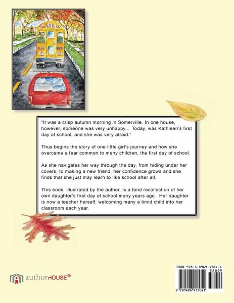 "It was a crisp autumn morning in Somerville. In one house, however, someone was very unhappy... Today, was Kathleen's first day of school, and she was very afraid." Thus begins the story of one little girl's journey and how she overcame a fear common to manychildren, the first day of school. As she navigates her way through the day, from hiding under her covers, to making a new friend, her confidence grows and she finds that she just may learn to like school after all. This book, illustrated by the author, is a fond recollection of her own daughter's first day of school many years ago. Her daughter is now a teacher herself, welcoming many a timid child into her classroom each year.