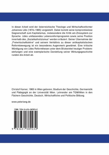 In dieser Arbeit wird der österreichische Theologe und Wirtschaftsreformer Johannes Ude (1874-1965) vorgestellt. Dabei kommt seine kompromisslose Gegnerschaft zum Kapitalismus, insbesondere die Kritik am Zinssystem zur Sprache. Udes umfassendes Lebensreformprogramm sowie seine Position innerhalb des "Sozialkatholizismus" werden erläutert. Seiner Übernahme der "Freiwirtschaftslehre" und seinem Verhältnis zu dieser antikapitalistischen Reformbewegung ist ein besonderes Augenmerk gewidmet. Eine kritische Würdigung von Udes Reformthesen unter dem Blickwinkel heutiger Problemstellungen und eine exemplarische Darstellung seiner Wirkungsgeschichte runden die Arbeit ab.