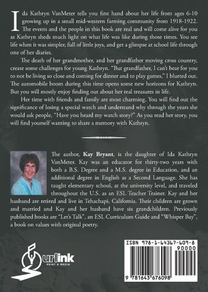 Ida Kathryn VanMeter tells you first hand about her life from ages 6-10 growing up in a small mid-western farming community from 1918-1922. The events and the people in this book are real and will come alive for you as Kathryn sheds much light on what life was like during those times. You see life when it was simpler, full of little joys, and get a glimpse at school life through one of her diaries. The death of her grandmother, and her grandfather moving cross country, create some challenges for young Kathryn. "But grandfather, I can't bear for you to not be living so close and coming for dinner and to play games," I blurted out. The automobile boom during this time opens some new horizons for Kathryn. But you will mostly enjoy finding out about her real treasures in life. Her time with friends and family are most charming. You will find out the significance of losing a special watch and understand why through the years she would ask people, "Have you heard my watch story?" As you read her story, you will find yourself wanting to share a memory with Kathryn.