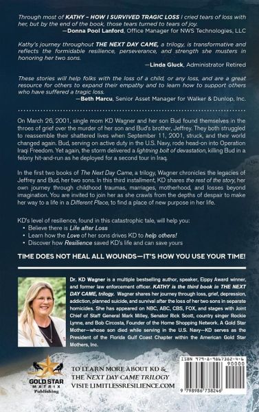 On March 26, 2001, single mom KD Wagner and her son Bud found themselves in the throes of grief over the murder of her son and Bud's brother, Jeffrey. They both struggled to reassemble their shattered lives when September 11, 2001, struck, and their world changed again. Bud, serving on active duty in the U.S. Navy, rode head-on into Operation Iraqi Freedom. Yet again, the storm delivered a lightning bolt of devastation, killing Bud in a felony hit-and-run as he deployed for a second tour in Iraq. In the first two books of The Next Day Came, a trilogy, Wagner chronicles the legacies of Jeffrey and Bud, her two sons. In this third installment, KD shares the rest of the story, her own journey through childhood traumas, marriages, motherhood, and losses beyond imagination. You are invited to join her as she crawls from the depths of despair to make her way to a life in a Different Place, to find a place of new purpose in her life. KD's level of resilience, found in this catastrophic tale, will help you: ¿Believe there is Life after Loss ¿Learn how the Love of her sons drives KD to help others ¿Discover how Resilience saved KD's life and can save yours TIME DOES NOT HEAL ALL WOUNDS - IT'S HOW YOU USE YOUR TIME!