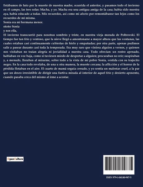 Estábamos de luto por la muerte de nuestra madre, ocurrida el anterior, y pasamos todo el invierno en él campo, las tres solas: Macha, y yo. Macha era una antigua amiga de la casa; había sido nuestra aya, había educado a todas. Mis recuerdos, así como mi afecto por remontábanse tan lejos como los recuerdos de mí misma. Sonia era mi hermana menor. otoño Sonia y nos ella, El invierno transcurrió para nosotras sombrío y triste, en nuestra vieja morada de Poltrovski. El tiempo fue tan frío y ventoso, que la nieve llegó a amontonarse a mayor altura que las ventanas, las cuales estaban casi continuamente cubiertas de hielo y empañadas; por otra parte, apenas pudimos salir a pasear durante casi toda la temporada. Era muy raro que viniera alguien a vernos, y quienes nos visitaban no traían alegría ni jovialidad a nuestra casa. Todo ofrecían: un rostro apenado, hablaban en voz baja, como si tuviesen miedo de despertar a alguien; procuraban no reír; suspiraban y, a menudo, lloraban al mirarme, sobre todo a la vista de mi pobre Sonia, vestida con su trajecito negro. En la casa todo revelaba, de una u otra manera, la muerte cercana; la aflicción y el horror de la pérdida flotaban en el aire. El cuarto de mamá seguía cerrado, y yo sentía un malestar cruel, a la par que un deseo irresistible de dirigir una furtiva mirada al interior de aquel frío y desierto aposento, cuando pasaba cerca del mismo al irme a acostar.