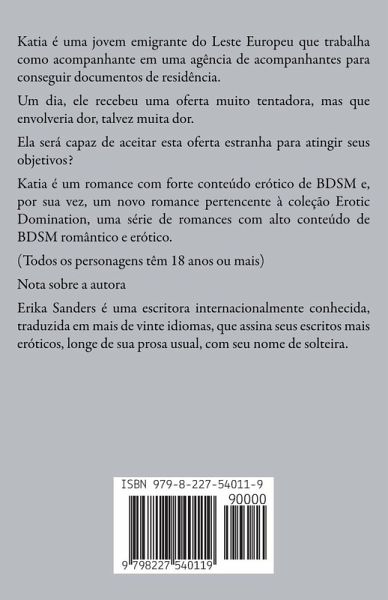 Katia é uma jovem emigrante do Leste Europeu que trabalha como acompanhante em uma agência de acompanhantes para conseguir documentos de residência. Um dia, ele recebeu uma oferta muito tentadora, mas que envolveria dor, talvez muita dor. Ela será capaz de aceitar esta oferta estranha para atingir seus objetivos? Katia é um romance com forte conteúdo erótico de BDSM e, por sua vez, um novo romance pertencente à coleção Erotic Domination, uma série de romances com alto conteúdo de BDSM romântico e erótico. (Todos os personagens têm 18 anos ou mais) Nota sobre a autora Erika Sanders é uma escritora internacionalmente conhecida, traduzida em mais de vinte idiomas, que assina seus escritos mais eróticos, longe de sua prosa usual, com seu nome de solteira.
