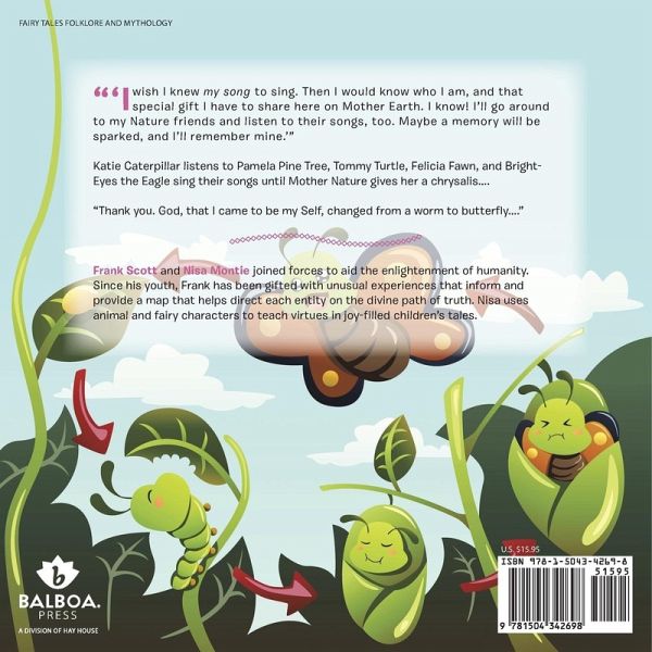 "'I wish I knew my song to sing. Then I would know who I am, and that special gift I have to share here on Mother Earth. I know! I'll go around to my Nature friends and listen to their songs, too. Maybe a memory will be sparked, and I'll remember mine.'" Katie Caterpillar listens to Pamela Pine Tree, Tommy Turtle, Felicia Fawn, and Bright-Eyes the Eagle sing their songs until Mother Nature gives her a chrysalis.... "Thank you. God, that I came to be my Self, changed from a worm to butterfly...."