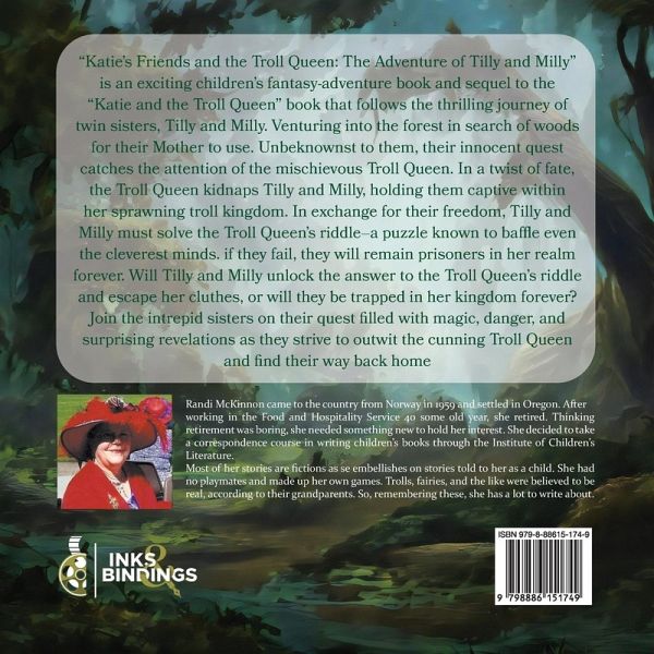 "Katie's Friends and the Troll Queen: The Adventure of Tilly and Milly" is an exciting children's fantasy-adventure book and the sequel to the "Katie and the Troll Queen" book that follows the thrilling journey of twin sisters, Tilly and Milly. Venturing into the forest in search of woods for their Mother to use. Unbeknownst to them, their innocent quest catches the attention of the mischievous Troll Queen. In a twist of fate, the Troll Queen kidnaps Tilly and Milly, holding them captive within her sprawling troll kingdom. In exchange for their freedom, Tilly and Milly must solve the Troll Queen's riddle - a puzzle known to baffle even the cleverest minds. If they fail, they will remain prisoners in her realm forever, Will Tilly and Milly unlock the answer to the Troll Queen's riddle and escape her clutches, or will they be trapped in her kingdom forever? Join the intrepid sisters on their quest filled with magic, danger, and surprising revelations as they strive to outwit the cunning Troll Queen and find their way back home.