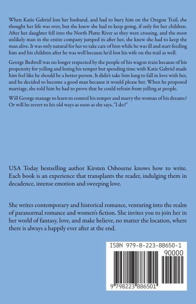 When Katie Gabriel lost her husband, and had to bury him on the Oregon Trail, she thought her life was over, but she knew she had to keep going, if only for her children. After her daughter fell into the North Platte River as they were crossing, and the most unlikely man in the entire company jumped in after her, she knew she had to keep the man alive. It was only natural for her to take care of him while he was ill and start feeding him and his children after he was well because he'd lost his wife on the trail as well. George Bedwell was no longer respected by the people of his wagon train because of his propensity for yelling and losing his temper but spending time with Katie Gabriel made him feel like he should be a better person. It didn't take him long to fall in love with her, and he decided to become a good man because it would please her. When he proposed marriage, she told him he had to prove that he could refrain from yelling at people. Will George manage to learn to control his temper and marry the woman of his dreams? Or will he revert to his old ways as soon as she says, "I do?"