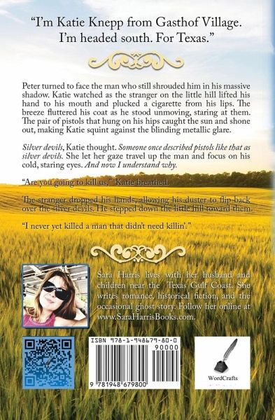 "I'm Katie Knepp from Gasthof Village. I'm headed south. For Texas." Peter turned to face the man who still shrouded him in his massive shadow. Katie watched as the stranger on the little hill lifted his hand to his mouth and plucked a cigarette from his lips. The breeze fluttered his coat as he stood unmoving, staring at them. The pair of pistols that hung on his hips caught the sun and shone out, making Katie squint against the blinding metallic glare. Silver devils, Katie thought. Someone once described pistols like that as silver devils. She let her gaze travel up the man and focus on his…mehr