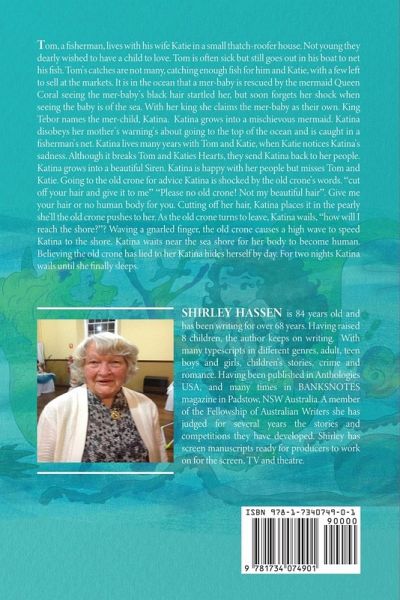 Tom, a fisherman, lives with his wife Katie in a small thatch-roofed house. Not young they dearly wished to have a child to love. Tom is often sick but still goes out in his boat to net his fish. Toms catches are not many, catching enough fish for him and Katie, with a few left to sell at the markets. It is in the ocean that a mer-baby is rescued by the mermaid Queen, Coral. Queen Coral seeing the mer-babys black-hair is startled but soon forgets her shock when seeing the baby is of the sea. With her King she claims the mer-baby as their own. King Trebor names the mer-child, Katina. Katina grows into a mischievous mer-maid. Katina disobeys her mothers warnings about going to the top of the ocean and is caught in a fishermans net. Katina lives many years with Tom and Katie when Katie notices Katinas sadness. Although it breaks Tom and Katies hearts, they send Katina back to her people. Katina grows into a beautiful Siren. Katina is happy with her people but misses Tom and Katie. Going to the old crone for advice, Katina is shocked by the old crones words. Cut off your hair and give it to me! Please! No! Old crone! Not my beautiful hair? Give me your hair or no human body for you! Cutting off her hair, Katina places it in the pearly shell the old crone pushes to her. As the old crone turns to leave, Katina wails, How will I reach the shore? Waving a gnarled finger the old crone causes a high wave to speed Katina to the shore. Katina waits near the sea shore for her body to become human. Believing the old crone has lied to her Katina hides herself by day. For two nights Katina wails until she finally sleeps.