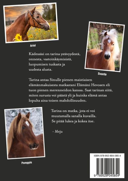 Kirja on tarina ystävyydestä, onnesta, vastoinkäymisistä, luopumisen tuskasta ja uudesta alusta. Suhteellisen herttaisesta kansikuvasta huolimatta mikään taianomainen lastensatu tämä ei kuitenkaan ole. Tarina antaa Sinulle pienen maistiaisen matkasta Elämän Hevosen eli tuon pienen merenneidon kanssa. Saat tarinan siitä, miten surusta voi päästä yli ja kuinka elämä antaa lopulta aina toisen mahdollisuuden. Tarina on matka, jota ei voi muutamalla sanalla kuvailla. Se pitää lukea ja kokea itse.