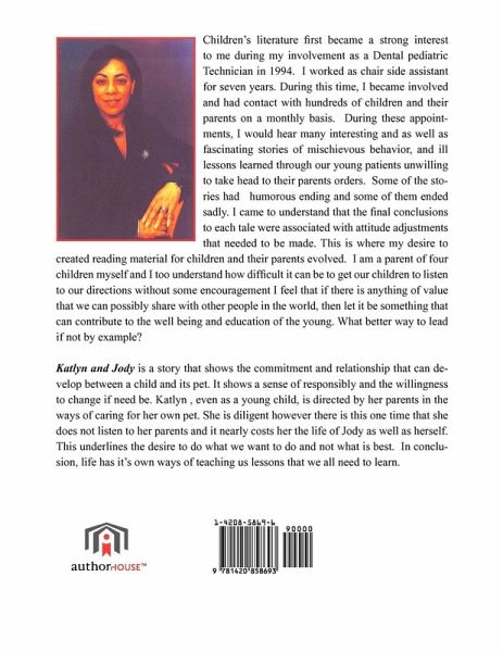 Katlyn and Jody is a story that shows the commitment and relationship that can develop between a child and her pet. It shows a sense of responsibility and the willingness to change if need be. Katlyn, even as a young child, is directed by her parents in the ways of caring for her own pet. She is diligent however there is this one time that she does not listen to her parents and it nearly costs her the life of Jody as well as herself. This underlines the desire to do what we want to do and not what is best. In conclusion, life has its own ways of teaching us lessons that we all need to learn. Overall, the story's contribution is designed to capture the imagination as well as to enlighten and impact a measure of comfort for the reader who may be dealing with a similar circumstance.