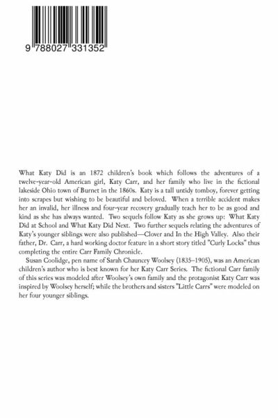 What Katy Did is an 1872 children's book which follows the adventures of a twelve-year-old American girl, Katy Carr, and her family who live in the fictional lakeside Ohio town of Burnet in the 1860s. Katy is a tall untidy tomboy, forever getting into scrapes but wishing to be beautiful and beloved. When a terrible accident makes her an invalid, her illness and four-year recovery gradually teach her to be as good and kind as she has always wanted. Two sequels follow Katy as she grows up: What Katy Did at School and What Katy Did Next. Two further sequels relating the adventures of Katy's younger siblings were also published-Clover and In the High Valley. Also their father, Dr. Carr, a hard working doctor feature in a short story titled "Curly Locks" thus completing the entire Carr Family Chronicle. Susan Coolidge, pen name of Sarah Chauncey Woolsey (1835-1905), was an American children's author who is best known for her Katy Carr Series. The fictional Carr family of this series was modeled after Woolsey's own family and the protagonist Katy Carr was inspired by Woolsey herself; while the brothers and sisters "Little Carrs" were modeled on her four younger siblings.