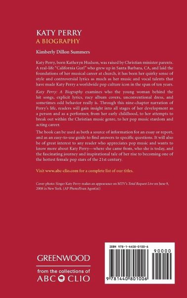 This biography reveals the life story, musical style, personality, lyrics, and fashion of Katy Perry-the elements that have catapulted her to stardom and made her a 21st-century pop music icon. Katy Perry: A Biography examines who the young woman behind the hit songs, explicit lyrics, racy album covers, unconventional dress, and sometimes odd behavior really is. Through this nine-chapter narration of Perry's life, readers will gain insight into all stages of her development as a person and as a performer, from her early childhood, to her attempts to break out within the Christian music genre, to her pop music stardom and acting career. The book can be used as both a source of information for an essay or report, and as an easy-to-use guide to find answers to specific questions. It will also be of great interest to any reader who appreciates pop music and wants to know more about Katy Perry-where she came from, who she is today, and the fascinating journey and inspirational tale of her rise to becoming one of the hottest female pop stars of the 21st century.