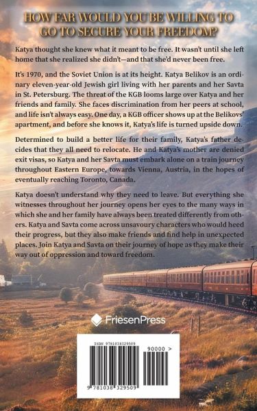 How far would you be willing to go to secure your freedom? Katya thought she knew what it meant to be free. It wasn't until she left home that she realized she didn't-and that she'd never been free. It's 1970, and the Soviet Union is at its height. Katya Belikov is an ordinary eleven-year-old Jewish girl living with her parents and her Savta in St. Petersburg. The threat of the KGB looms large over Katya and her friends and family. She faces discrimination from her peers at school, and life isn't always easy. One day, a KGB officer shows up at the Belikovs' apartment, and before she knows it, Katya's life is turned upside down. Determined to build a better life for their family, Katya's father decides that they all need to relocate. He and Katya's mother are denied exit visas, so Katya and her Savta must embark alone on a train journey throughout Eastern Europe, towards Vienna, Austria, in the hopes of eventually reaching Toronto, Canada. Katya doesn't understand why they need to leave. But everything she witnesses throughout her journey opens her eyes to the many ways in which she and her family have always been treated differently from others. Katya and Savta come across unsavoury characters who would heed their progress, but they also make friends and find help in unexpected places. Join Katya and Savta on their journey of hope as they make their way out of oppression and toward freedom.