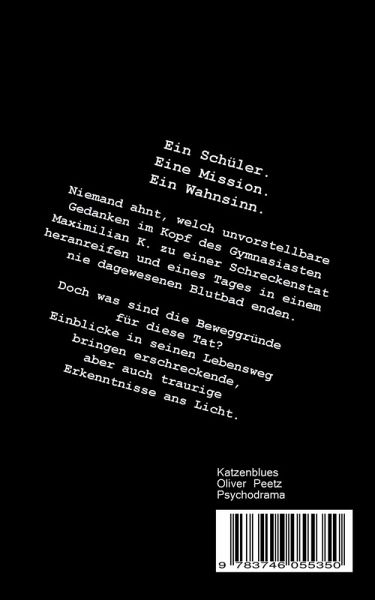 Ein Schüler.Eine Mission.Ein Wahnsinn.Niemand ahnt, welch unvorstellbare Gedanken im Kopf des Gymnasiasten Maximilian K. zu einer Schreckenstat heranreifen und eines Tages in einem nie dagewesenen Blutbad enden. Doch was sind die Gründe für diese Tat? Einblicke in seinen Lebensweg bringen erschreckende, aber auch traurige Erkenntnisse ans Licht.