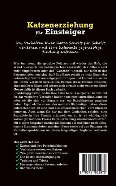 Was tun, wenn die geliebte Fellnase mal wieder das Sofa, die Wand oder auch den Lieblingsschrank zerkratzt, das Futter erneut nicht aufgefressen oder das "Geschäft" überall, nur nicht in der Katzentoilette, verrichtet hat? Ihre Katze schafft es nicht, Ihnen das notwendige Vertrauen entgegenzubringen und kommt nur selten aus Ihrem Versteck heraus? Sie kennen diese kleinen Problemchen mit Ihrer Katze und wissen sich einfach nicht weiterzuhelfen? Genau dafür ist dieses Buch gedacht.Unabhängig davon, ob Sie Ihre Katze bereits seit Jahren haben und ihr das verkehrte Verhalten leider noch nicht austreiben konnten oder ob Sie sich vor Kurzem erst ein Babykätzchen zugelegt haben. Egal, ob Sie einen oder mehrere Stubentiger haben, diese unterschiedlich alt sind und aus unterschiedlichen Verhältnissen kommen. Auch wenn Sie nur mit dem Gedanken spielen, eine Samtpfote in Ihre Familie aufzunehmen, so ist es wichtig, sich vorher gut mit dem Thema Katzenerziehung auseinanderzusetzen.Mit diesemRatgeber werden Sie bestens auf das Ihnen noch unbekannte Zusammenleben mit einer Katze sowie auf den Umgang mit Verhaltensproblemen bei ihrem langzeitigen Begleiter vorbereitet.Das erwartet Sie:-Katzen und ihre Persönlichkeiten-Verhaltensweisen von Katzen-Wie gewinnen Sie das Vertrauen?-Die besten Beschäftigungen-Training und Tricks-Ein angenehmes Zusammenleben-und vieles mehr ...