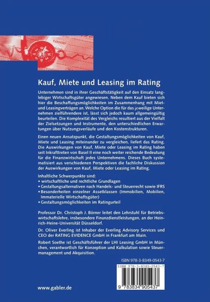 Vom Hochregal bis zum Verwaltungsgebäude - Leasing kennt keine Grenzen. Aber: Welche Auswirkungen haben Kauf, Leasing oder Miete auf das Rating? Welche Vor- und Nachteile verbinden sich mit den unterschiedlichen Finanzierungsmöglichkeiten? Dieses Praxisbuch gibt wertvolle Ratschläge zur Gestaltung intelligent strukturierter Finanzierungslösungen, mit denen Ertragsziele erreicht und Risiken beschränkt werden können. Die Folgen sind ein besseres Rating und die langfristige Sicherung des Unternehmensbestandes. Das Buch lässt Experten aus Praxis und Wissenschaft zu Wort kommen, die sich aus unterschiedlichen Perspektiven mit betriebs- und finanzwirtschaftlichen Implikationen von Kauf, Miete und Leasing befassen.