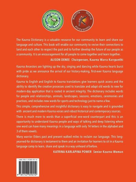 The Kaurna Dictionary is a valuable resource for our community to learn and share our language and culture. This book will enable our community to revive their connections to land and each other to respect the past and to further develop the future of our people as a community. It is an encouragement for all people to come together and learn together. ALISON DENEE Chairperson, Kaurna Warra Karrpanthi Kaurna Ancestors are lighting up the sky, singing and dancing while Kaurna hearts burst with pride as we announce the arrival of our history-making, first-ever Kaurna language dictionary. Kaurna to English and English to Kaurna translations give learners quick access and the ability to identify the creative processes used to translate and adapt old words to new for modern-day application that is rooted in ancient integrity. The dictionary includes words for people and relationships, animals, landscapes, seasons, emotions, ceremonies and practices, and includes new words for sports and technology just to name a few. This simple, comprehensive and insightful dictionary is easy to navigate and is grounded with ancient and modern Kaurna voices and robust historical and contemporary sources. There is much more to words than a superficial one-word counterpart and this is an opportunity to understand Kaurna people and ways of talking and deep listening where one word can have many meanings in a language with only 14 letters in the alphabet and 3 of them vowels. Many warrior Elders past and present walked miles to reclaim our language. This long- yearned-for dictionary is testament to them and an invitation for learners to sit in a Kaurna language camp to learn, share and speak in a way unheard of before. KATRINA KARLAPANA POWER Senior Kaurna Woman
