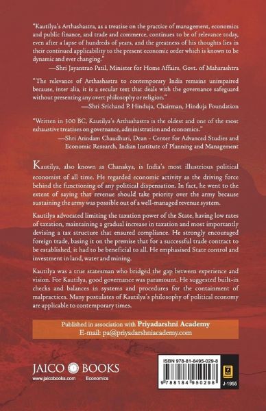 Kautilya, also known as Chanakya, is India's most illustrious political economist of all time. He regarded economic activity as the driving force behind the functioning of any political dispensation. In fact, he went to the extent of saying that revenue should take priority over the army because sustaining the army was possible out of a well-managed revenue system. Kautilya advocated limiting the taxation power of the State, having low rates of taxation, maintaining a gradual increase in taxation and most importantly devising a tax structure that ensured compliance. He strongly encouraged foreign trade, basing it on the premise that for a successful trade contract to be established, it had to be beneficial to all. He emphasised State control and investment in land, water and mining. Kautilya was a true statesman who bridged the gap between experience and vision. For Kautilya, good governance was paramount. He suggested built-in checks and balances in systems and procedures for the containment of malpractices. Many postulates of Kautilya's philosophy of political economy are applicable to contemporary times.