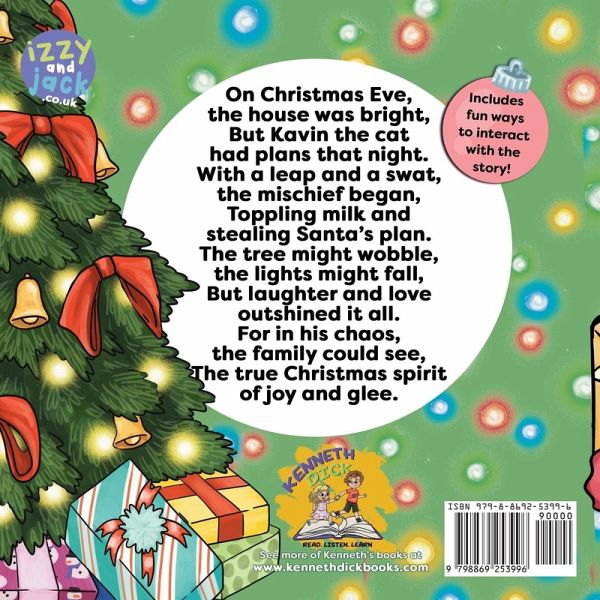Kavin's Christmas Eve Mischief One curious cat. One cozy Christmas. Countless giggles! Get ready for a holiday adventure that's as heartwarming as it is hilarious! Kavin's Christmas Eve Mischief follows a silver Bengal cat named Kavin who has a knack for turning peaceful moments into joyful mayhem. On the night before Christmas, when all through the house not a creature should be stirring... Kavin has other plans. From toppling a bowl of milk with a perfectly timed leap, to launching cereal snowstorms, stealing Santa's cookies, and even becoming the unwelcome star on top of the Christmas tree, Kavin's antics are full of festive flair. But even in the middle of the chaos, there's something magical about the way he brings the family together through laughter and love.Perfect for children ages 3-8 and families who adore cats and Christmas Whimsical rhyming narration that's fun to read aloud during holiday storytime Delightful illustrations on every page that bring Kavin's mischief to life A sweet message about finding joy in the unexpected Whether you have a mischievous cat of your own or just love festive family stories, this book will make you laugh, smile, and maybe even remind you that the best Christmas memories are the messy, magical ones. What Readers Are Saying:"Kavin is basically our cat at Christmas-chaotic, curious, and totally lovable! My kids laughed on every page."- Megan T., parent"The illustrations are magical, and the story is the perfect mix of funny and heartfelt. We read it every year now."- Daniel R., dad of two"A hit in my classroom! Kids love seeing what Kavin does next-and so do I."- Ms. Jaime H., preschool teacher Make Kavin a part of your holiday tradition-add to your cart today!