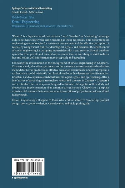 Part I. Introduction.- Chapter 1. Kawaii Engineering.- Part II. Systematic study on kawaii engineering.- Chapter 2. Systematic Measurement and Evaluations for Kawaii Products.- Chapter 3. Affective Evaluation for Material Perception of Bead-Coated Resin Surfaces Using Visual and Tactile Sensations - Focusing on Kawaii -.- Chapter4. Kawaiiness in Motion.- Chapter 5. Measurement and Evaluations of Kawaii Products by Biological Signals.- Chapter 6. Measurements and Evaluations of Kawaii Products by Eye Tracking.- Chapter 7. Meaning of "Kawaii" from a Psychological Perspective.- Part III. Applications of kawaii engineering.- Chapter 8. Kawaii spoons for senior citizens.- Chapter 9. Toward Practical Implementation of an Emotion-Driven Digital Camera Using EEG.- Chapter 10. Evaluation of Key Emotional Value for Saudi Women.- Chapter 11. Model of Kawaii Spoon Evaluations by Thai and Japanese.- Chapter 12. Model of Kawaii Cosmetic Bottle Evaluations by Thai and Japanese.- Chapter 13. Kawaii Perception of Artifacts Between Chinese and Japanese Cultures.- Chapter 14. How "Kawaii" Became the Key Concept of Our Tiny Electric Car.- Part IV. Epilogue.- Chapter 15. Editor's Summary.