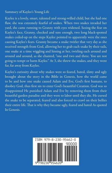 Summary of Kaylee's Young Life Kaylee is a lovely, smart, talented and strong-willed child, but she had one flaw, she was extremely fearful of snakes. When two snakes invaded her yard, she came running to Granny with eyes widened. Seeing the fear on Kaylee's face, Granny, checked and sure enough, two long black-spotted snakes coiled-up on the steps. Granny became a snake twirler that very day as she received strength from God, allowing her to grab each snake by their tails, one snake at a time wiggling and hissing at her, twirling each around and around and around, as she chanted, "one and two and three. You are not going to tempt or harm my Kaylee." At 3, she threw the snakes, and they went far, far away from Kaylee. Kaylee's curiosity about why snakes were so feared, hated, slimy and ugly brought about the story in the Bible in Genesis, how the world came to be and how one snake caused Adam and Eve, God's first humans, to disobey God, thus first sin to enter God's beautiful Creation. God was so disappointed He punished Adam and Eve by removing them from their beautiful garden paradise and they were to labor until they die. He cursed all Snake to be separated, feared and also forced to crawl on their bellies their entire life. That is why they became ugly, feared and hated As quoted In Genesis.