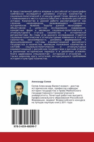 V predstavlennoj rabote vpervye v rossijskoj istoriografii komplexno issleduetsya dinamika statusa kazachestva s social'no-politicheskoj i jetnokul'turnoj tochek zreniya v svyazi s izmeneniem ego mesta i roli v sobytiyah i yavleniyah rossijskoj istorii. Kazachestvo v dannoj rabote rassmatrivaetsya kak slozhnoe, neodnorodnoe, razvivajushheesya social'no-istoricheskoe yavlenie. Zadacha dannoj monografii - ob#ektivnoe i celostnoe issledovanie soderzhaniya, konkretnyh form i jevoljucii social'no-politicheskogo i jetnokul'turnogo statusa kazachestva v istoricheskoj retrospektive. Vo glavu ugla dannogo issledovaniya stavyatsya social'no-politicheskie i jetnokul'turnye izmeneniya v statuse kazachestva, zakonomernosti, dinamika formirovaniya i funkcionirovaniya sistemy vzaimootnoshenij rossijskogo gosudarstva i kazachestva, jevoljuciya polozheniya kazachestva v sisteme social'no-politicheskih i jetnokul'turnyh vzaimootnoshenij s rossijskim gosudarstvom i russkim jetnosom v razlichnye istoricheskie periody i v razlichnyh usloviyah. Kniga adresovana specialistam - istorikam i jetnologam, - a takzhe shirokomu krugu chitatelej, interesujushhihsya problemami istorii i kul'tury kazachestva.