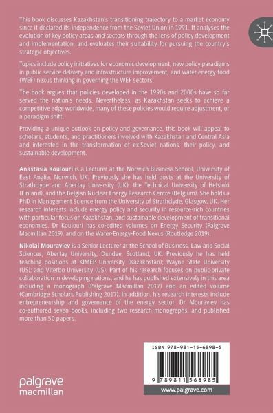 This book discusses Kazakhstan's transitioning trajectory to a market economy since it declared its independence from the Soviet Union in 1991.. It analyses the evolution of key policy areas and sectors through the lens of policy development and implementation, and evaluates their suitability in pursuing the country's strategic objectives. Topics include policy initiatives for economic development, new policy paradigms in public service delivery and infrastructure improvement, and water-energy-food (WEF) nexus thinking in governing the WEF sectors. The book argues that policies developed in the 1990s and 2000s have so far served the nation's needs. Nevertheless, as Kazakhstan seeks to achieve a competitive edge worldwide, many of these policies would require adjustment, or a paradigm shift. Providing a unique outlook on policy and governance, this book will appeal to scholars, students, and practitioners involvedwith Kazakhstan and Central Asia and interested in the transformation of ex-Soviet nations, their policy, and sustainable development.